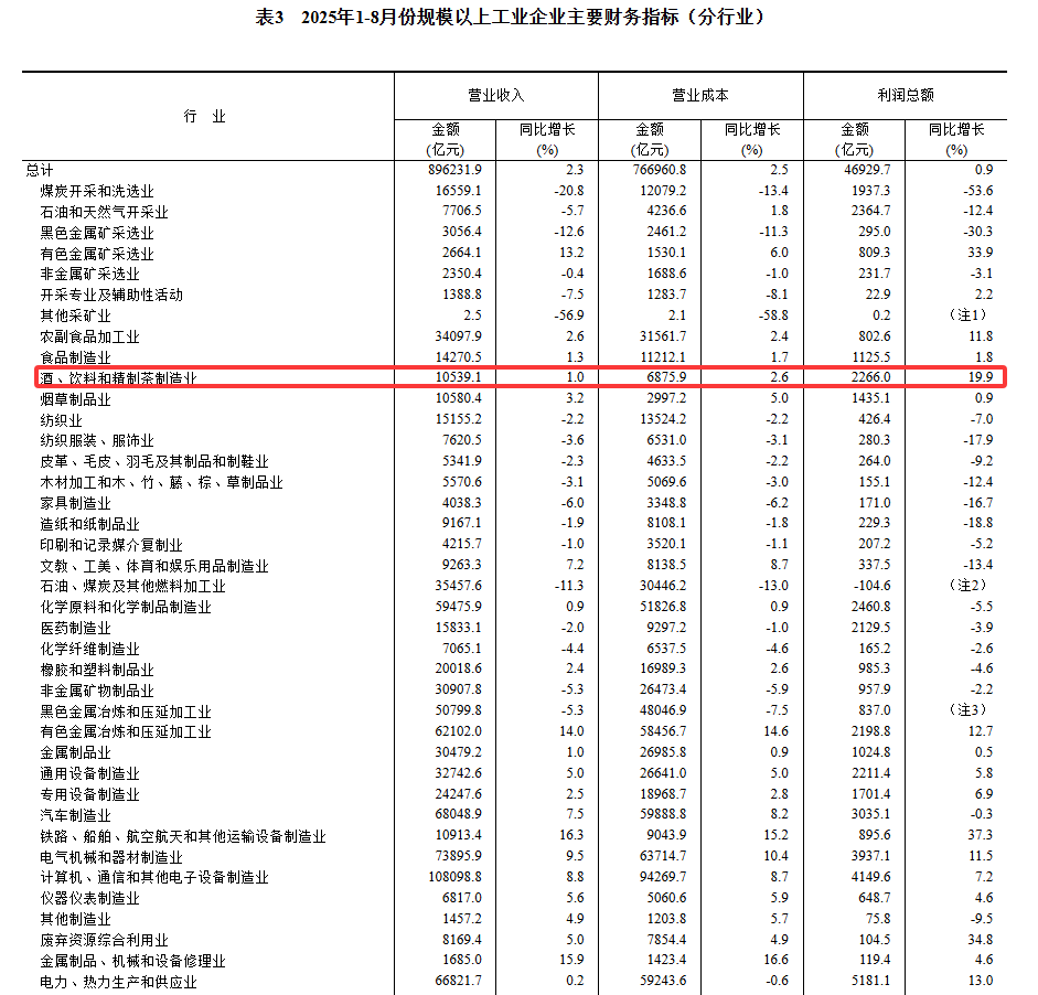 民以食为天,一日三餐是老百姓的头等大事。当下,我国食品饮料行业在复杂的国内外经济环境下,呈现出较强韧性的发展态势。根据国家统计局发布的数据显示,2025年1-8月,我国饮料制造业营业收入累计达到10539.1亿元,累计增长1.0%;更为亮眼的是,饮料制造业实现利润总额2266.0亿元,累计增长高达19.9%。这表明在收入小幅增长的同时,行业盈利能力显著提升,效益改善明显。
