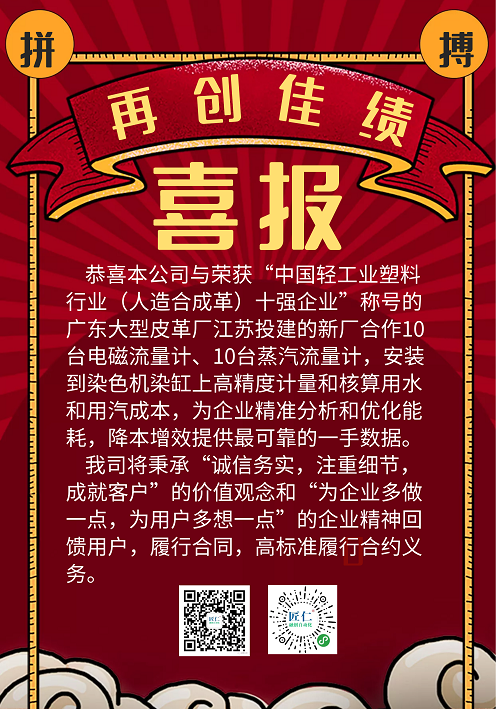 【喜讯】恭喜本公司与广东大型皮革厂江苏分公司合作20台流量计